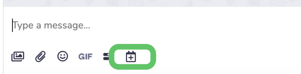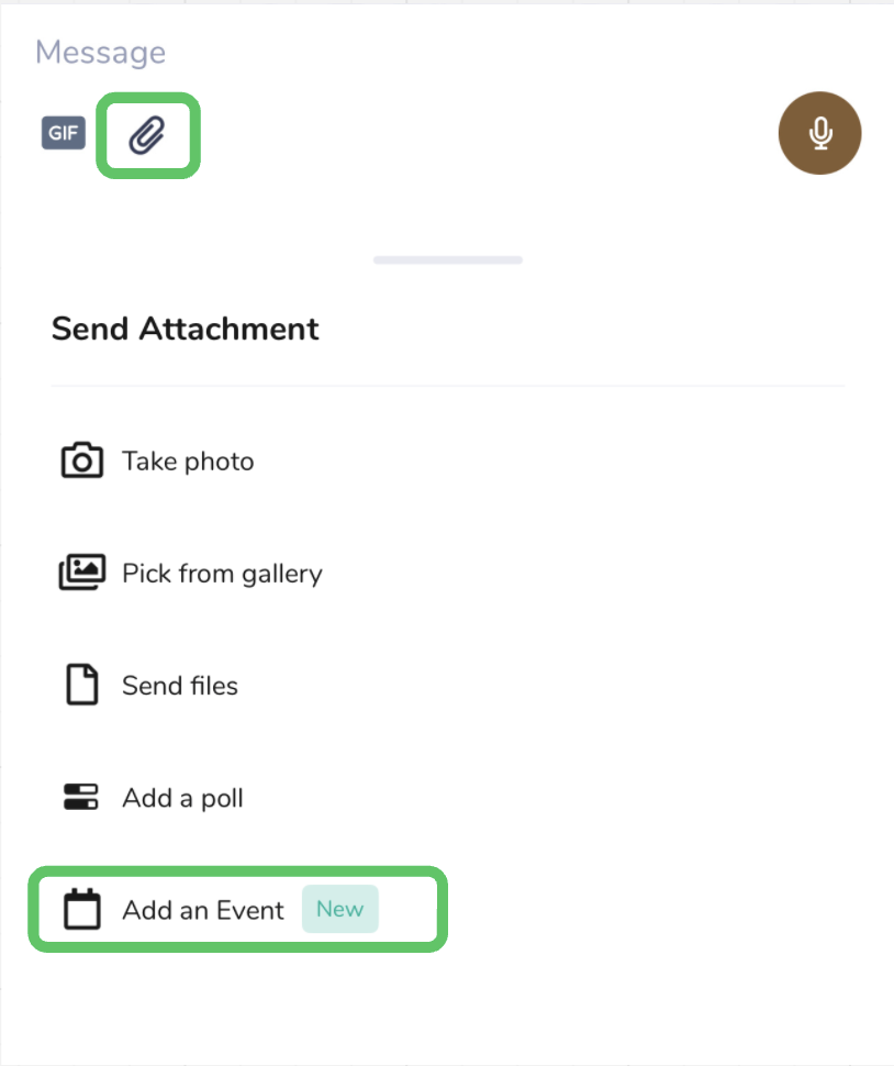 1) Within a chat group, you can create an Event that will invite all of the chat’s members. Click the attachment icon, then the “Add an Event” button.