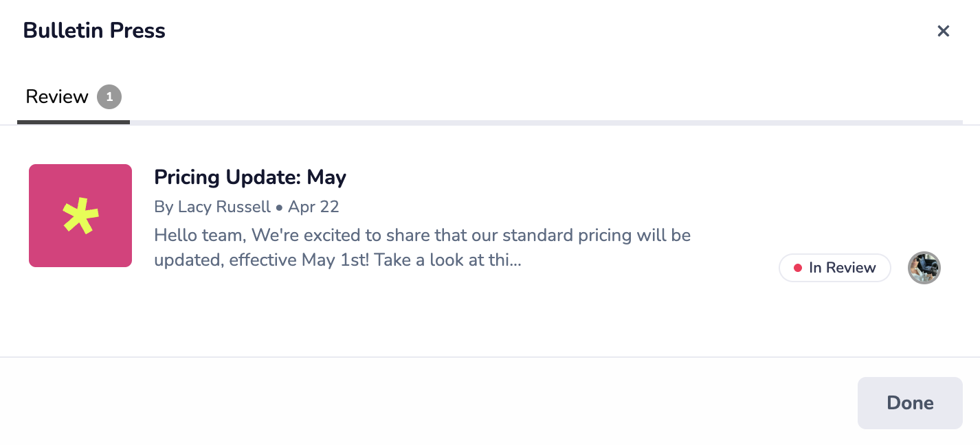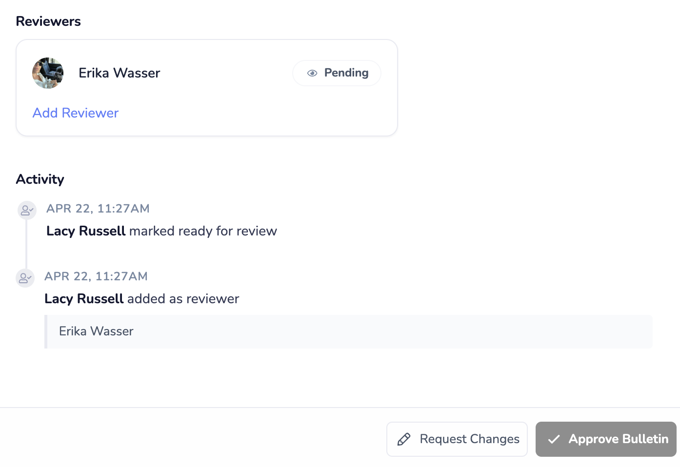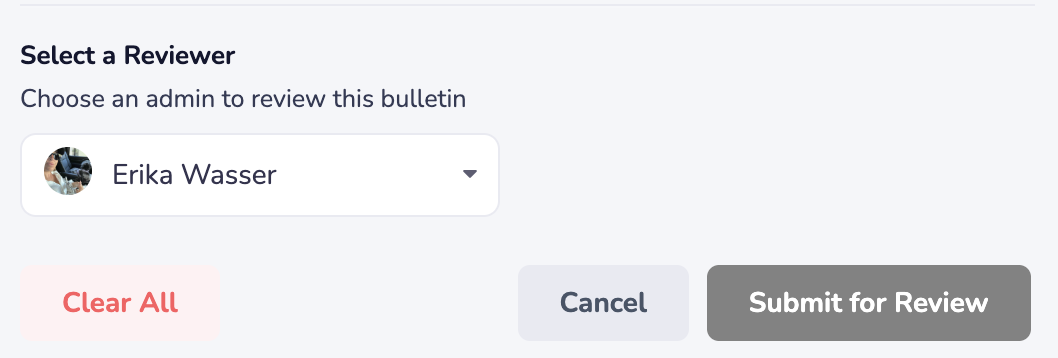 1) As a Manager creating a Bulletin post, there will be a dropdown at the bottom of the Bulletin settings to “Select a Reviewer”.