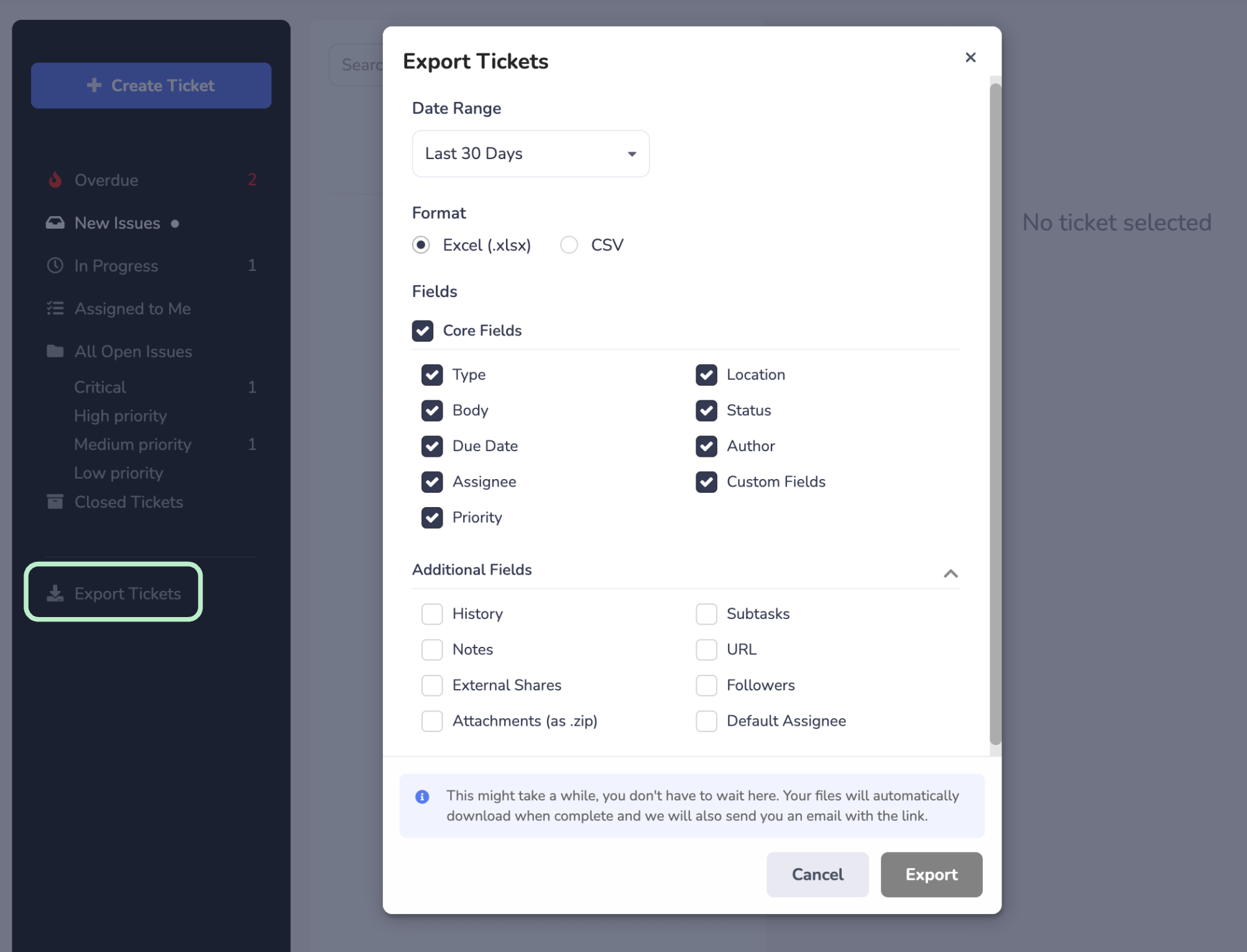 Click “Export Tickets” and choose your range, format, and fields.