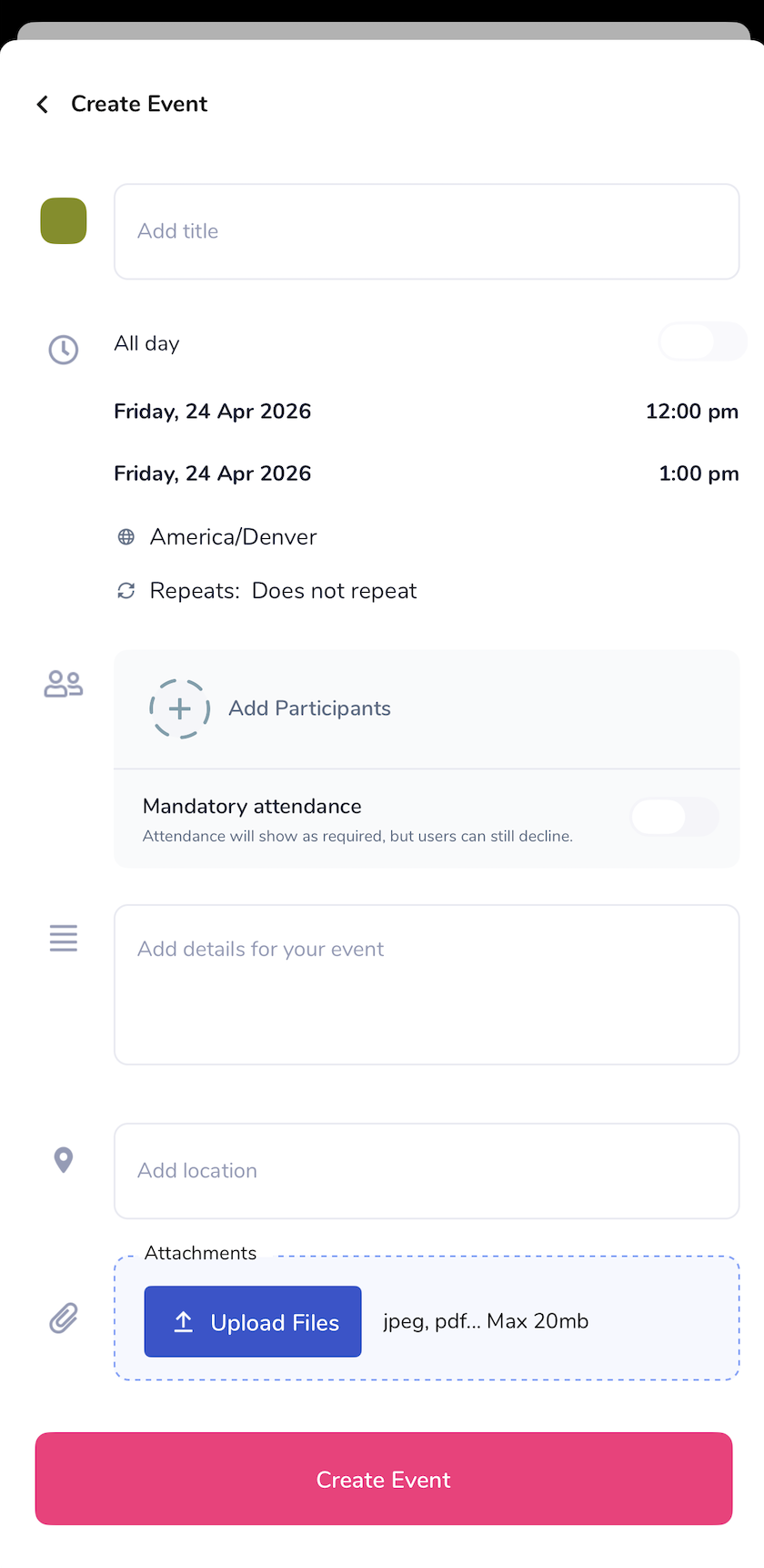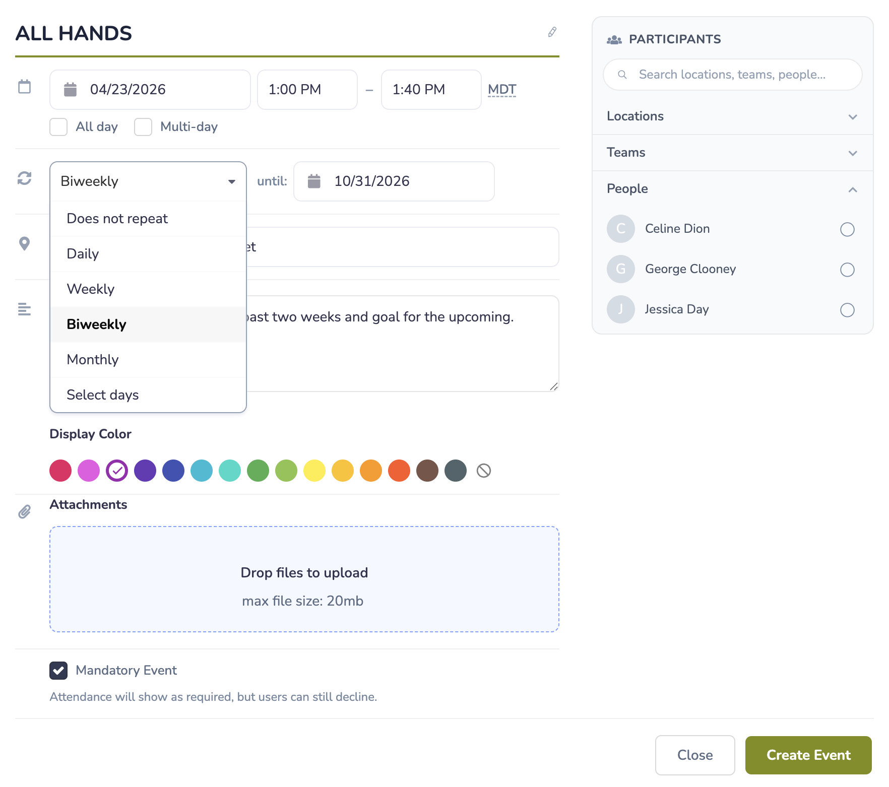 2) Use the “Create Event” button in the upper right-hand corner and build your event details: start date/time, all day, multi-day, repetition, location, description, color, files, mandatory designation, and participant by Locations, Teams, or individuals.