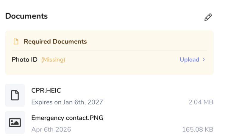 Use Documents in Prospr to keep important employee files organized and easy to access. Teams often use Documents to track items like CPR certifications, TIPS certifications, driver’s licenses, and other required records - including expiration dates.