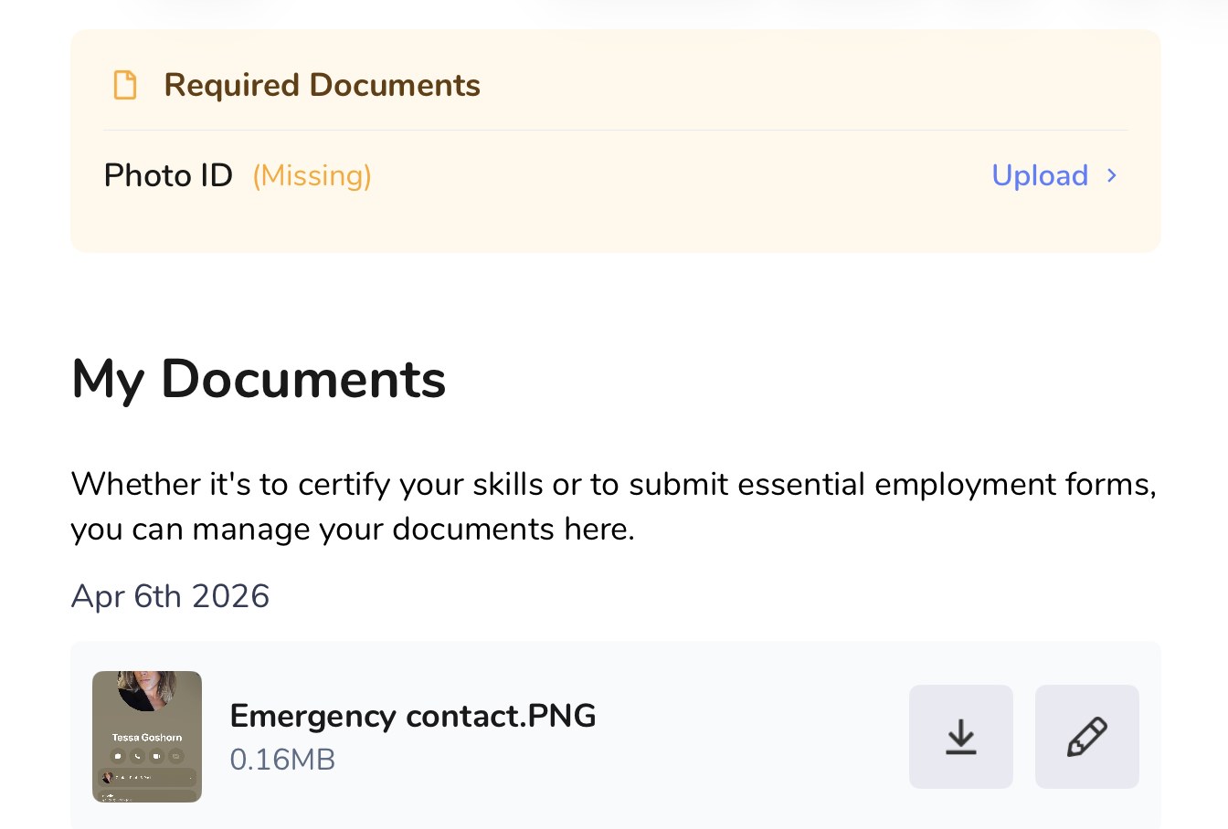Your workplace may request or require certain documents from you and ask that they be uploaded and stored in Prospr. This helps keep important employment records organized, up to date, and easy for your management team to review when needed.